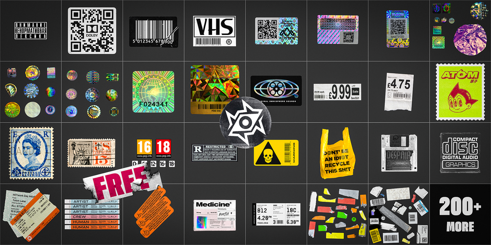 Inspired by real-world packaging, shipping, and product labels, these stickers are ideal for designers working on branding, album art, posters, editorials, or digital collages.